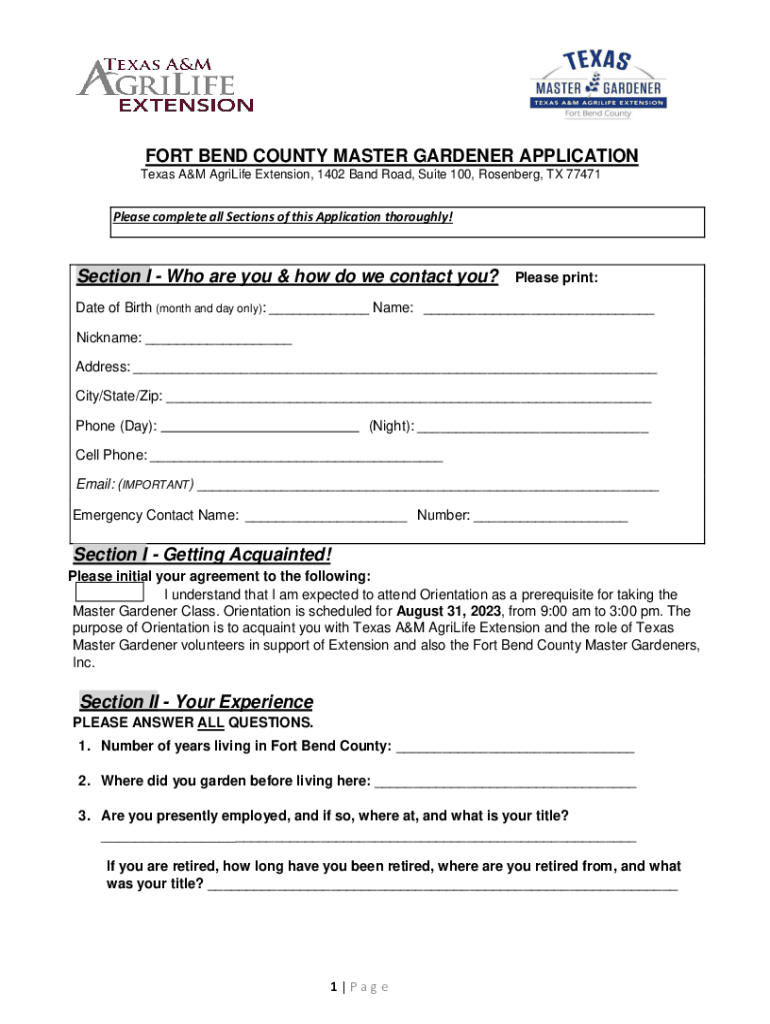 pdfFiller makes it easy to finish and sign fort bend master gardeners online. It lets you make changes to original PDF content, highlight, black out, erase, and write text anywhere on a page, legally eSign your form, and more, all from one place. Create a free account and use the web to keep track of professional documents.