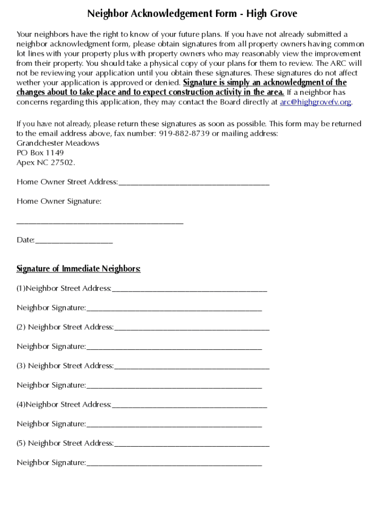Get the free Neighbor Acknowledgement Form - High Grove
