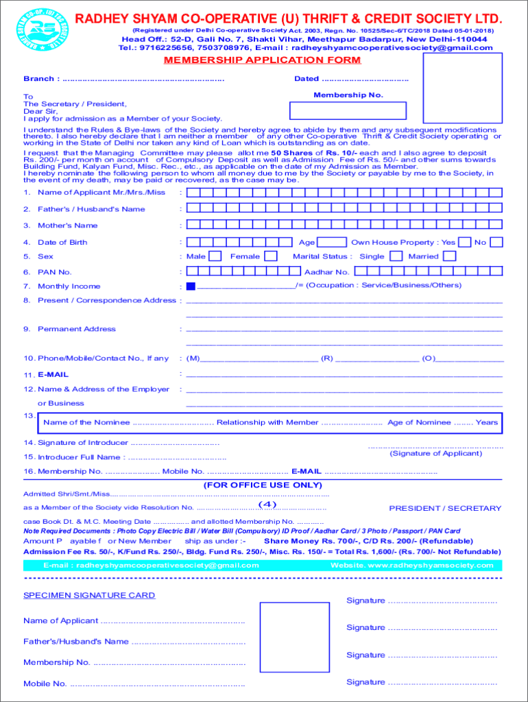 RADLEY SHAM COOPERATIVE (U) THRIFT & CREDIT SOCIETY LTD. (Registered under Delhi Cooperative Society Act. 2003, Reign. No. 10525/Sec6/TC/2018 Dated 05012018)Head O.: 52D, Mali No. 7, Shakti Vicar,