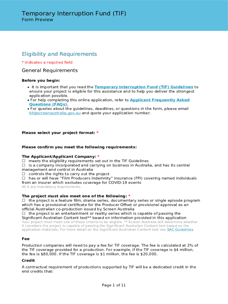 Temporary Interruption Fund (TIF) Form PreviewEligibility and Requirements * indicates a required general Requirements Before you begin: It is important that you read the Temporary Interruption Fund