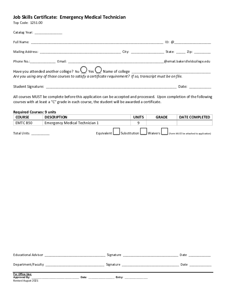 Job Skills Certificate: Emergency Medical Technician Top Code: 1251.00Catalog Year: ___ Full Name: ___ ID: @___ Mailing Address: ___ City: ___ State: ___ Zip: ___ Phone No.:___ Email: ___@email.bakersfieldcollege.eduHave