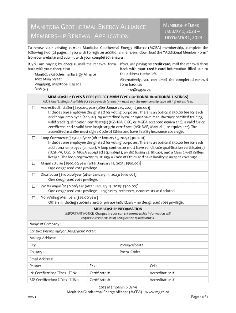 MEMBERSHIP TERM: JANUARY 1, 2023, DECEMBER 31, 2023MANITOBA GEOTHERMAL ENERGY ALLIANCE MEMBERSHIP RENEWAL Application renew your existing current Manitoba Geothermal Energy Alliance (GEA) membership,