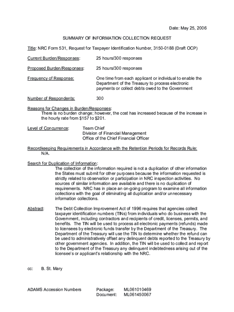 Title: NRC Form 531, Request for Taxpayer Identification Number, 31500188 (Draft OCP)