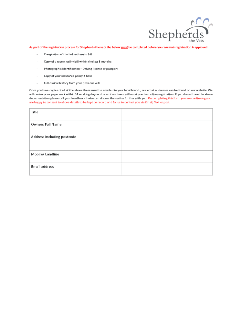 As part of the registry on process for Shepherds the vets the below must be completed before your animals registry on is approved: