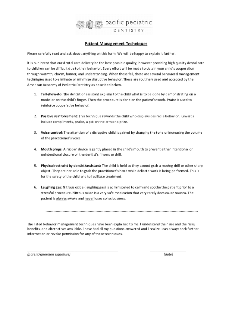 Patient Management Techniques Please carefully read and ask about anything on this form. We will be happy to explain it further. It is our intent that our dental care delivery be the best possible