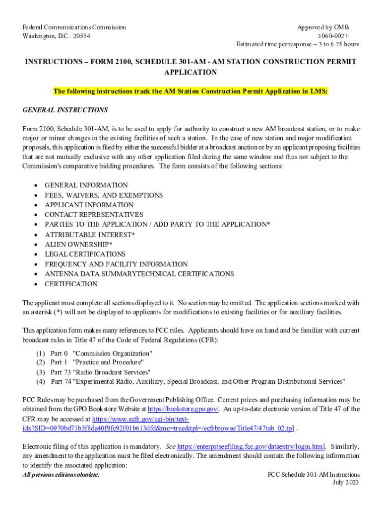 Federal Communications Commission Washington, D.C. 20554Approved by OMB 30600027 Estimated time per response 3 to 6.25 hoursINSTRUCTIONS FORM 2100, SCHEDULE 301AM AM STATION CONSTRUCTION PERMIT APPLICATION