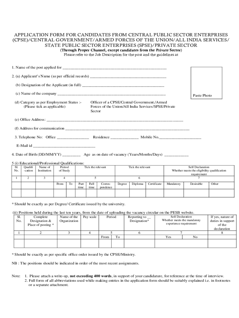 APPLICATION FORM FOR CANDIDATES FROM CENTRAL PUBLIC SECTOR ENTERPRISES (CASE)/CENTRAL GOVERNMENT/ARMED FORCES OF THE UNION/ALL INDIA SERVICES/ STATE PUBLIC SECTOR ENTERPRISES (APSE)/PRIVATE SECTOR