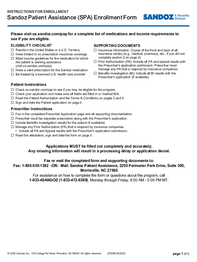 INSTRUCTIONS FOR ENROLLMENTSandoz Patient Assistance (SPA) Enrollment Form Please visit us.sandoz.com/pap for a complete list of medications and income requirements to see if you are eligible. ELIGIBILITY