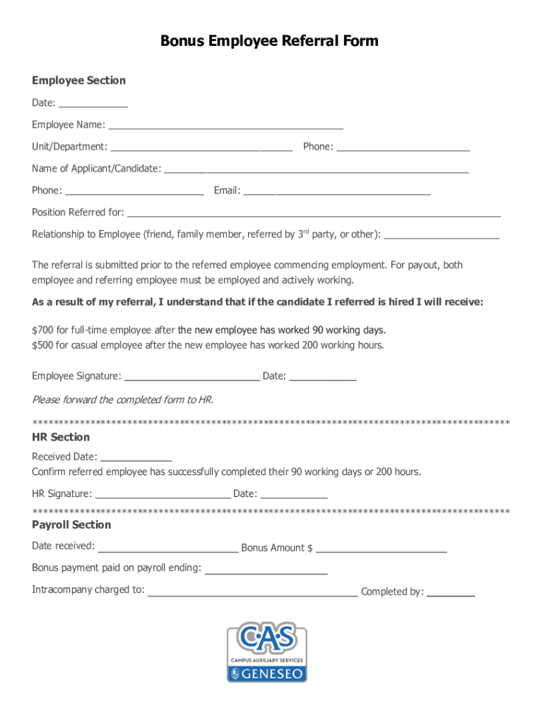 Bonus Employee Referral Form Employee Section Date: ___ Employee Name: ___ Unit/Department: ___Phone: ___ Name of Applicant/Candidate: ___ Phone: ___ Email: ___ Position Referred for: ___ Relationship