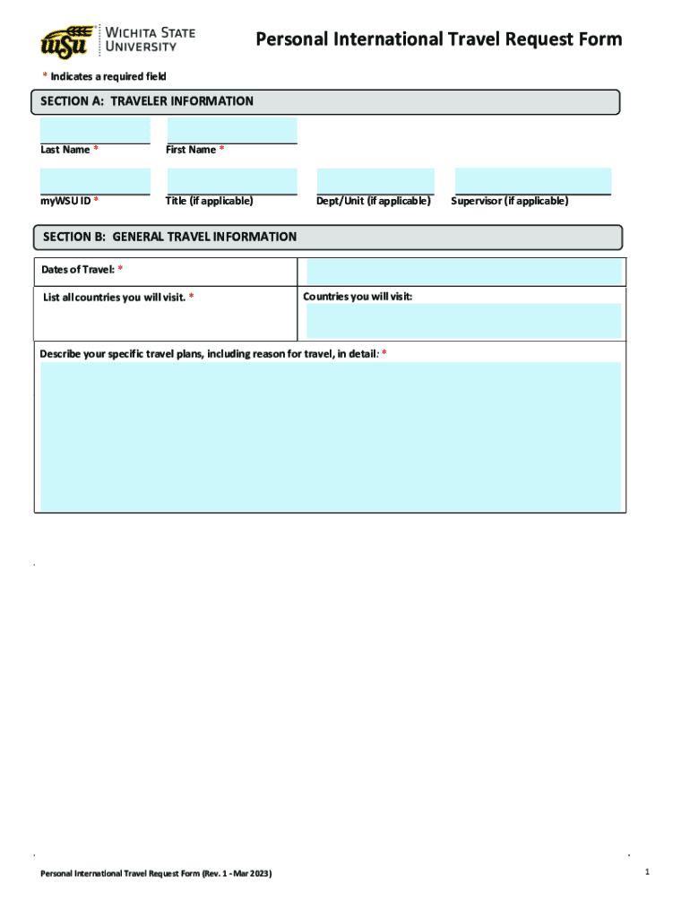 Personal International Travel Request Form * Indicates a required midsection A: TRAVELER INFORMATION Last Name *First Name *my WSU ID *Title (if applicable)Dept/Unit (if applicable)Supervisor (if