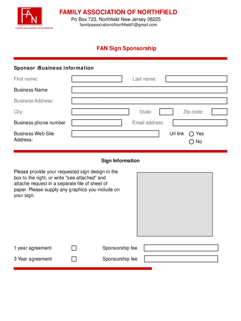FAMILY ASSOCIATION OF NORTHFIELD Po Box 723, Northfield New Jersey 08225 familyassociationofnorthfield1@gmail.comFAN Sign Sponsorship Sponsor /Business information First name:Last name:Business Name