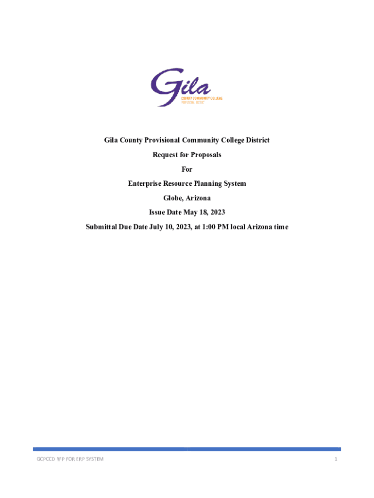 Gila County Provisional Community College District Request for Proposals For Enterprise Resource Planning System Globe, Arizona Issue Date May 18, 2023, Submittal Due Date July 10, 2023, at 1:00 PM