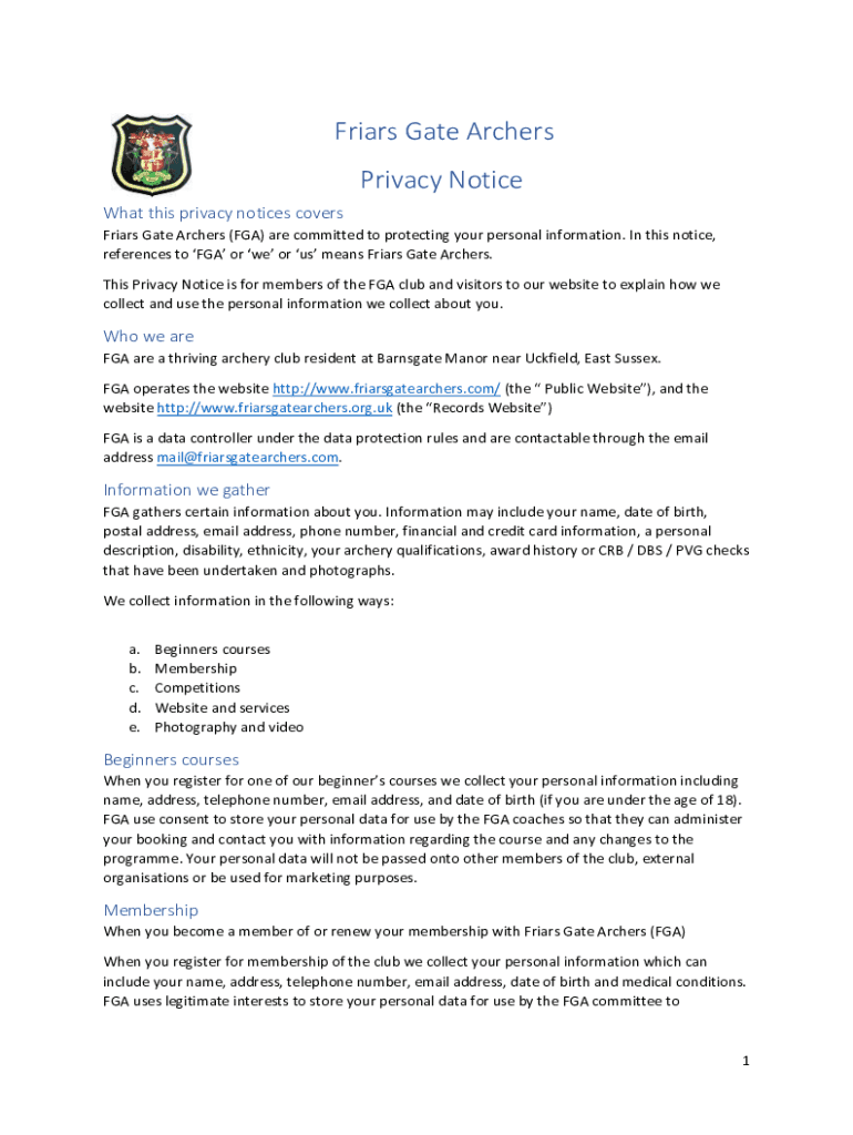 Friars Gate Archers Privacy Notice What this privacy notices covers Friars Gate Archers (FFA) are committed to protecting your personal information. In this notice, references to FFA or we or us means
