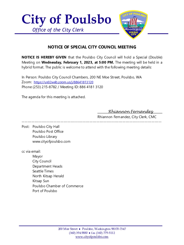 City of Polls Office of the City ClerkNOTICE OF SPECIAL CITY COUNCIL MEETING NOTICE IS HEREBY GIVEN that the Polls City Council will hold a Special (Double) Meeting on Wednesday, February 1, 2023,