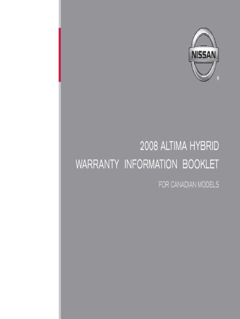 2008 ALT IMA HYBRID WARRANTY INFORMATION BOOKLET FOR CANADIAN MODEL SAN IMPORTANT MESSAGE TO OWNERS NISSAN SATISFACTION ADVANTAGE The NISSAN Satisfaction Advantage brings real benefits to you as a