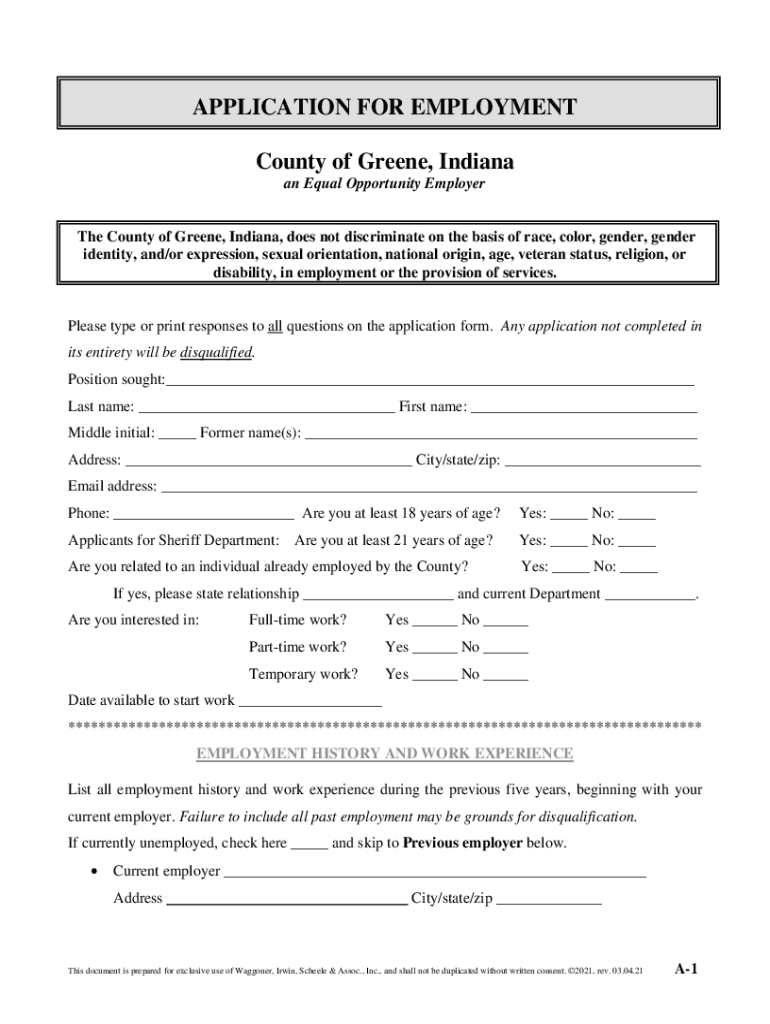 APPLICATION FOR EMPLOYMENT County of Greene, Indiana an Equal Opportunity Employee County of Greene, Indiana, does not discriminate on the basis of race, color, gender, gender identity, and/or expression,