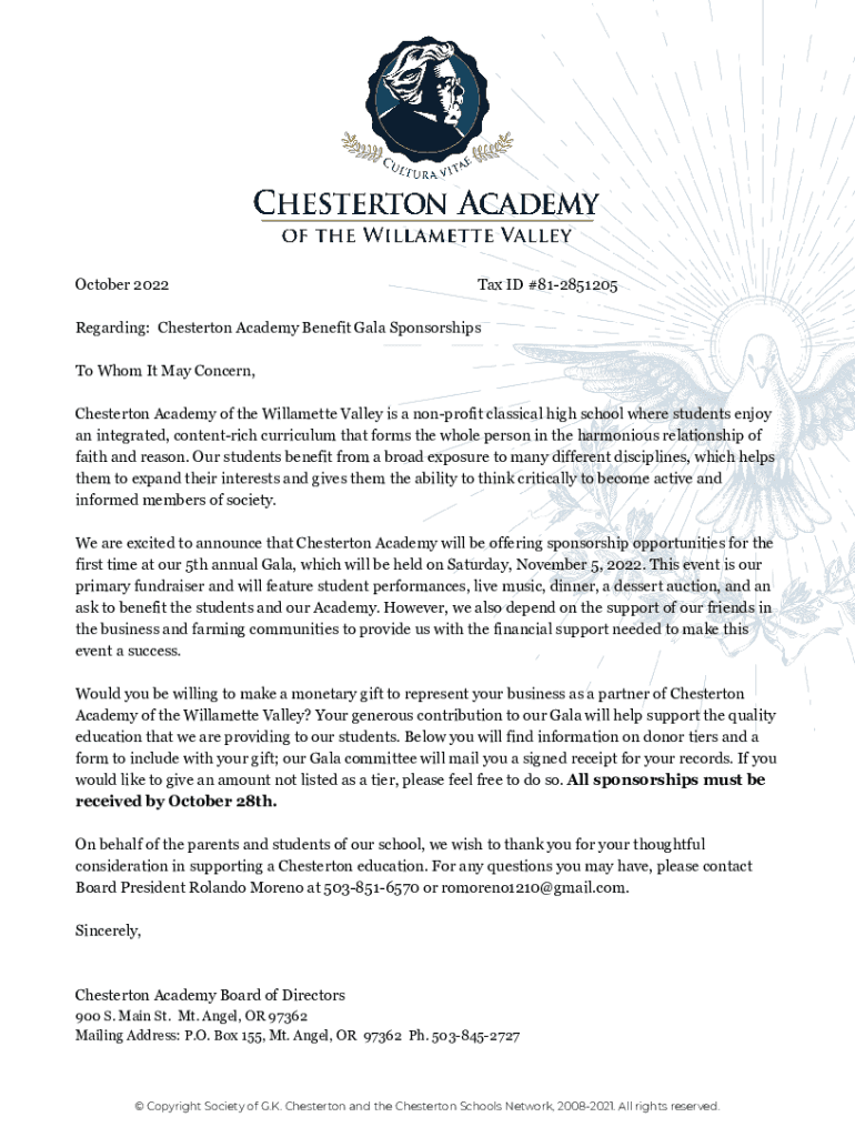 October 2022Tax ID #812851205Regarding: Chesterton Academy Benefit Gala Sponsorships To Whom It May Concern, Chesterton Academy of the Willamette Valley is a nonprofit classical high school where