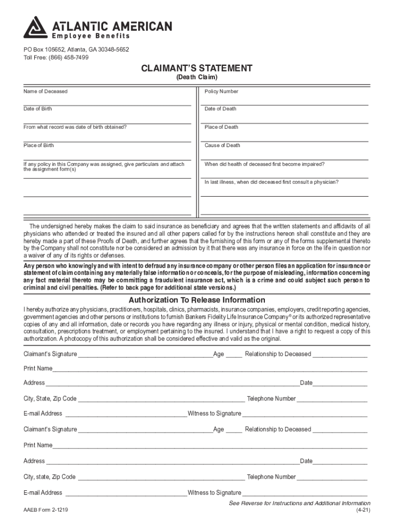 Get the free bankers fidelity life insurance company - claimant's statement