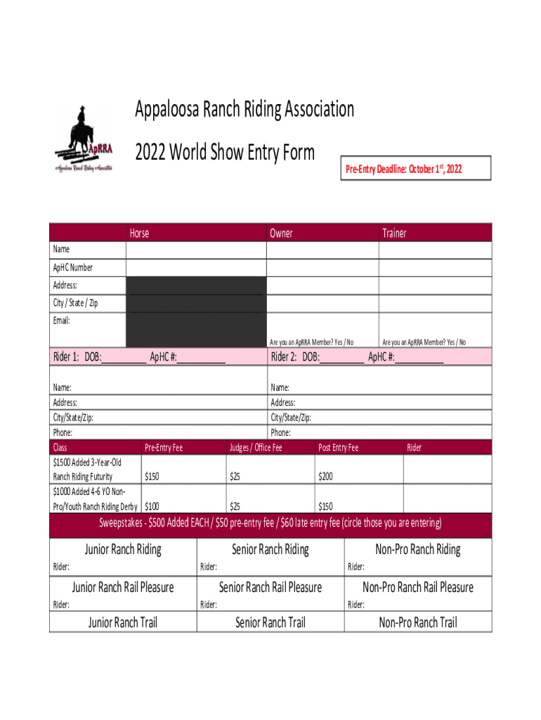 HorsePreEntry Deadline: October 1st, 2022OwnerTrainerAre you an Area Member? Yes / Are you an Area Member? Yes / Nonage