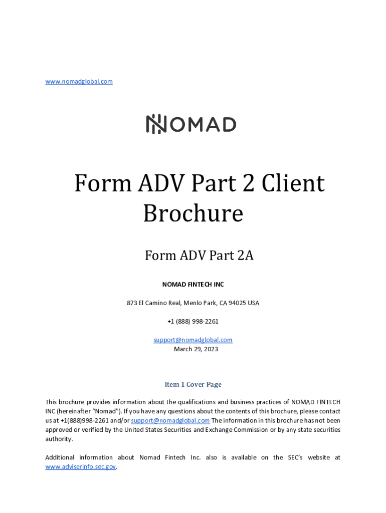 Item 1 Cover PageThisbrochureprovidesinformationaboutthequalificationsandbusinesspracticesofNOMADFINTECH