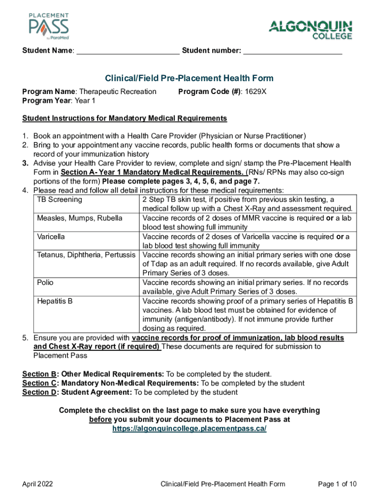 Student Name: ___ Student number: ___Clinical/Field Replacement Health Form Program Name: Therapeutic Recreation Program Year: Year 1Program Code (#): 1629XStudent Instructions for Mandatory Medical