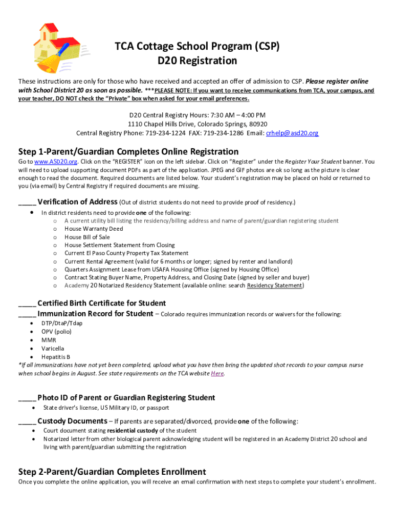 TCA Cottage School Program (CSP) D20 Registration These instructions are only for those who have received and accepted an offer of admission to CSP. Please register online with School District 20
