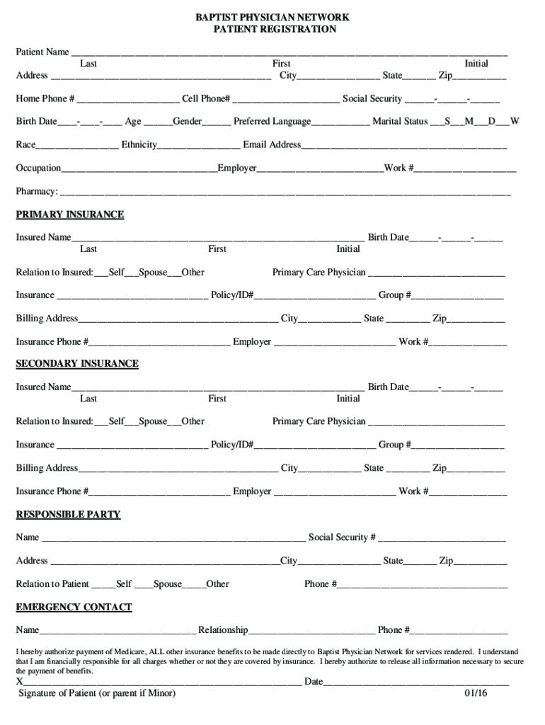BAPTIST PHYSICIAN NETWORK PATIENT REGISTRATION Patient Name ___ Last First Initial Address ___ City___ State___ Zip___ Home Phone # ___ Cell Phone# ___ Social Security _________ Birth Date_________