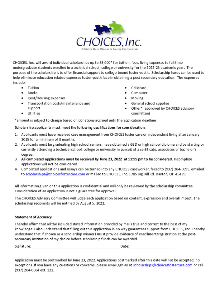 CHOICES, Inc. will award individual scholarships up to $3,000* for tuition, fees, living expenses to full time undergraduate students enrolled in a technical school, college or university for the