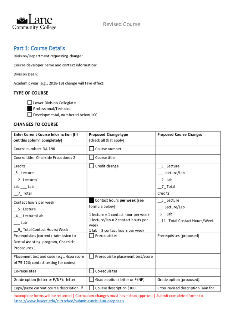 Revised Courseware 1: Course Details Division/Department requesting change: Course developer name and contact information: Division Dean: Academic year (e.g., 201819) change will take effect:TYPE