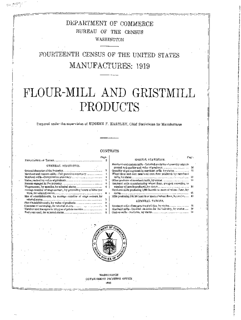 DEPARTMENT OF COMMERCE BUREAU OF THE CENSUS WASHINGTONFOURTEENTH CENSUS OF THE UNITED STATESMANUFACTURES: 1919FLOURMILL AND GRISTMILL PRODUCTS Prepared under the supervision of EUGENE F. HARTLEY,