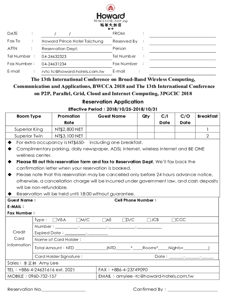 Data To Howard Prince Hotel TaichungReserved By ATTNReservation Dept. Personnel Number 0424632323Tel Number Number0424631234Fax Number Emailrvtctc@howardhotels.com.twEmail/FROM/The 13th International