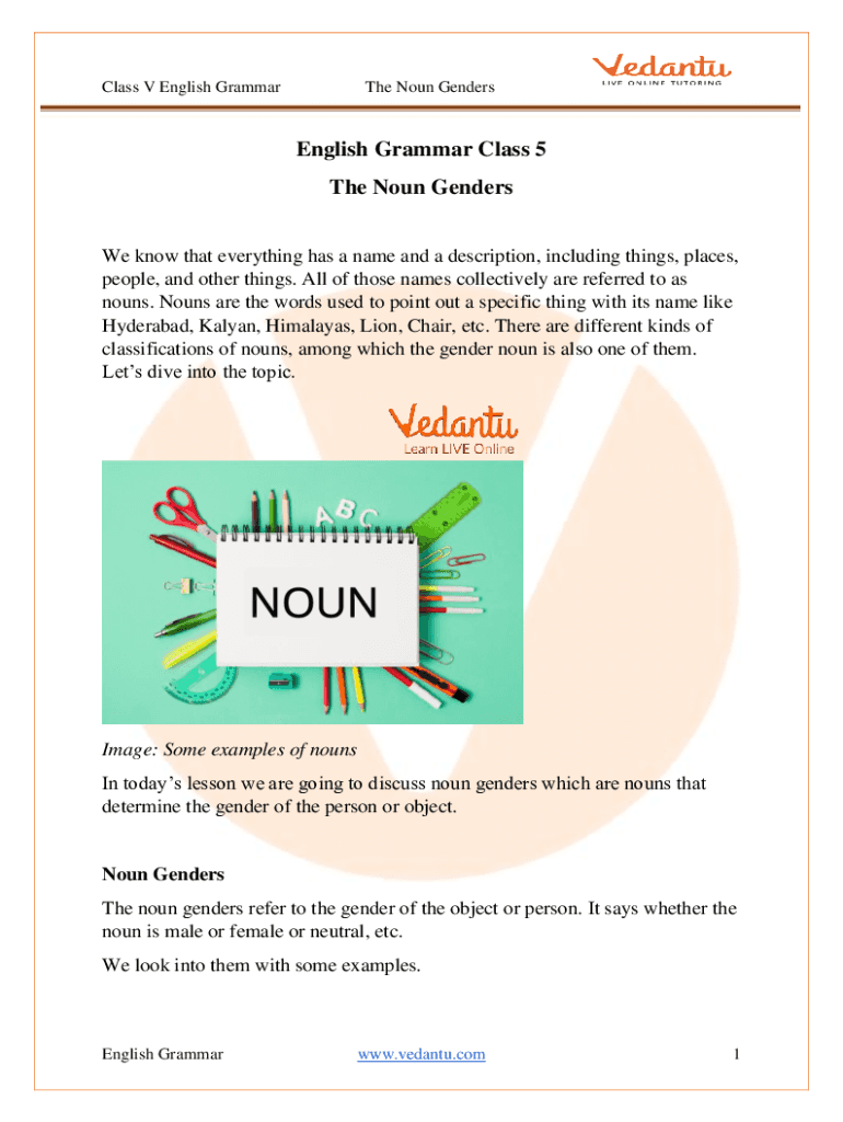 Class V English Grammar Noun Genders English Grammar Class 5 The Noun Genders We know that everything has a name and a description, including things, places, people, and other things. All of those