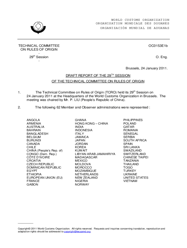 WORLD CUSTOMS ORGANIZATION MONDALE DES DOUBLES ORGANIZATION SUNDIAL DE ADUANASTECHNICAL COMMITTEE ON RULES OF ORIGIN 29th Session OC0153E1bO. Eng.Brussels, 24 January 2011. DRAFT REPORT OF THE 29TH