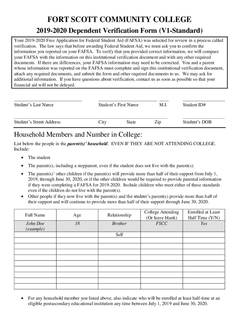 FORT SCOTT COMMUNITY COLLEGE 20192020 Dependent Verification Form (V1Standard) Your 20192020 Free Application for Federal Student Aid (FAFSA) was selected for review in a process called verification.