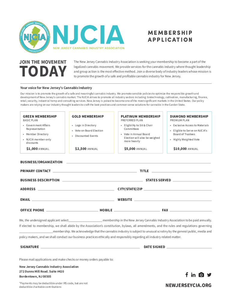 MEMBERSHIP A P P L I C AT I O N JOIN THE MOVEMENTTODAYThe New Jersey Cannabis Industry Association is seeking your membership to become a part of the legalized cannabis movement. We provide services