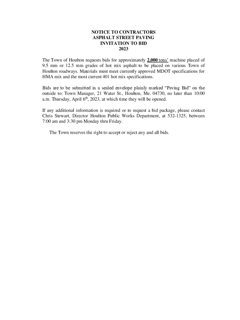 NOTICE TO CONTRACTORS ASPHALT STREET PAVING INVITATION TO BID 2023 The Town of Houston requests bids for approximately 2,000 tons machine placed of 9.5 mm or 12.5 mm grades of hot mix asphalt to be