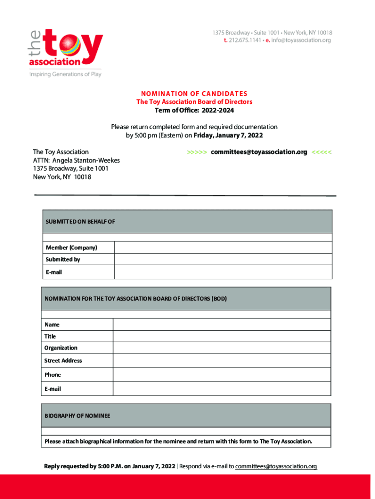 NOMINATION OF CANDIDATES The Toy Association Board of Directors Term of Office: 20222024 Please return completed form and required documentation by 5:00 pm (Eastern) on Friday, January 7, 2022, The