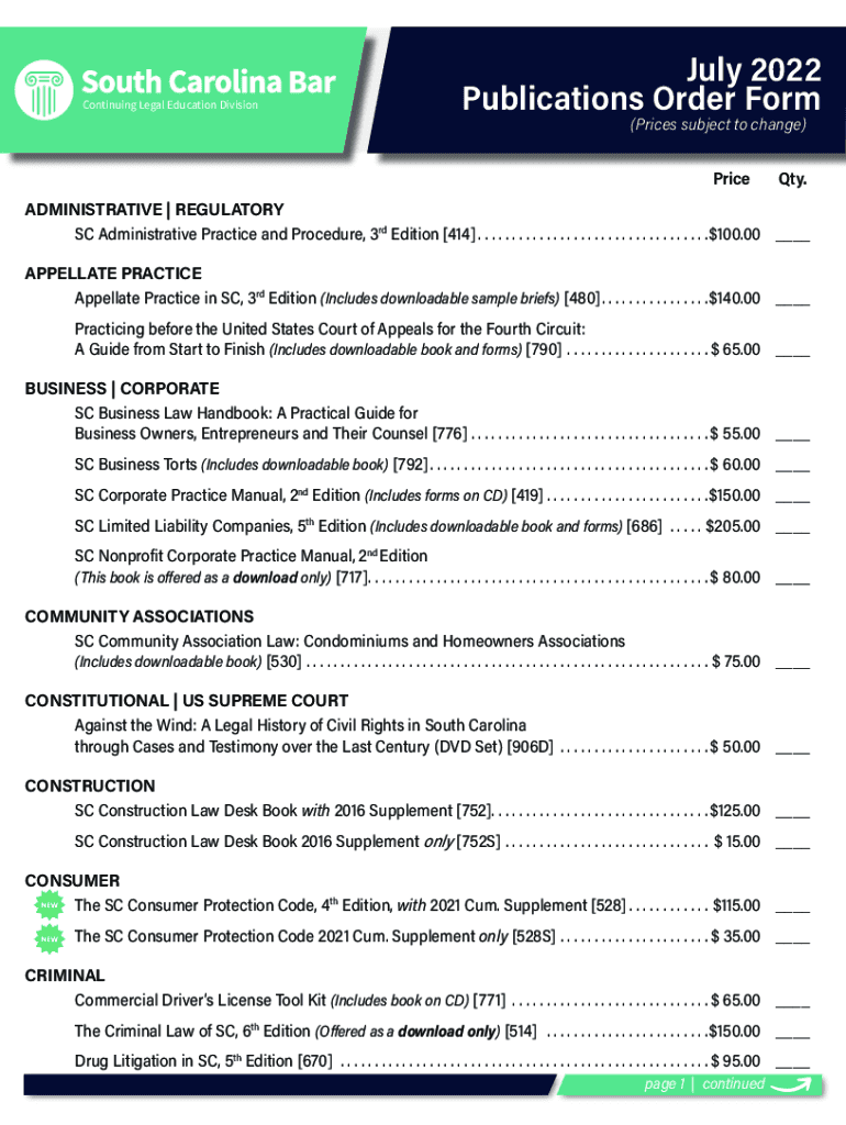 July 2022 Order FormContinuing Legal Education Division July 2022 Publications Order Form (Prices subject to change) Pricey. ADMINISTRATIVE | REGULATORY SC Administrative Practice and Procedure, 3rd