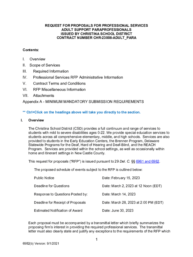 REQUEST FOR PROPOSALS FOR PROFESSIONAL SERVICES ADULT SUPPORT PARAPROFESSIONALS ISSUED BY CHRISTINA SCHOOL DISTRICT CONTRACT NUMBER CHR23008ADULT_PARA Contents:I. OverviewII. Scope of Services III.