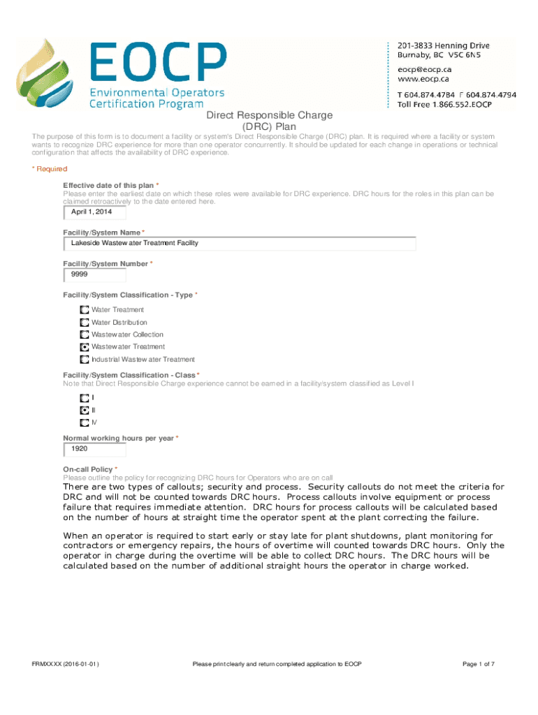 Direct Responsible Charge (DRC) Plan The purpose of this form is to document a facility or system\'s Direct Responsible Charge (DRC) plan. It is required where a facility or system wants to recognize