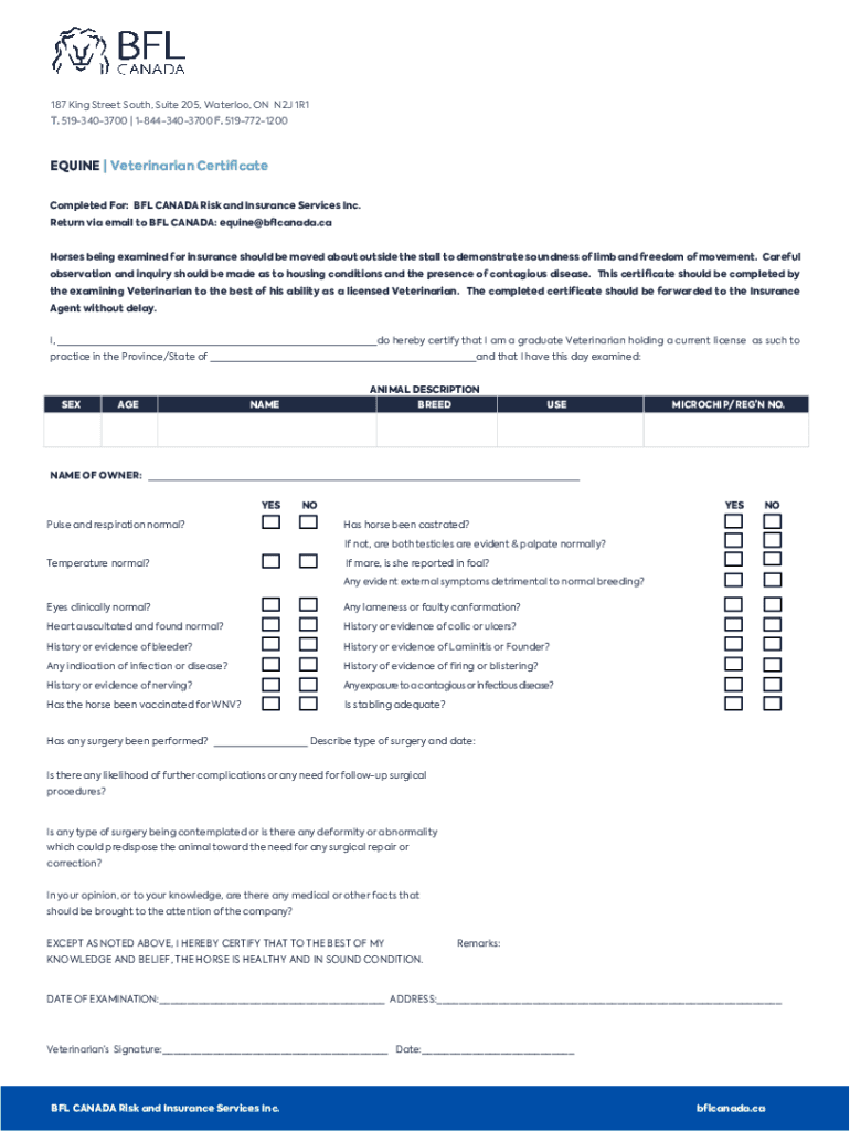 187 King Street South, Suite 205, Waterloo, ON N2J 1R1 T. 5193403700 | 18443403700 F. 5197721200EQUINE | Veterinarian Certificate Completed For: BFL CANADA Risk and Insurance Services Inc. Return