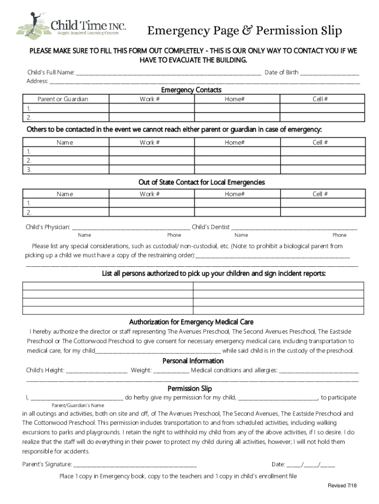 Emergency Page & Permission Slip PLEASE MAKE SURE TO FILL THIS FORM OUT COMPLETELY THIS IS OUR ONLY WAY TO CONTACT YOU IF WE HAVE TO EVACUATE THE BUILDING. Child's Full Name: ___ Date of Birth ___Address: