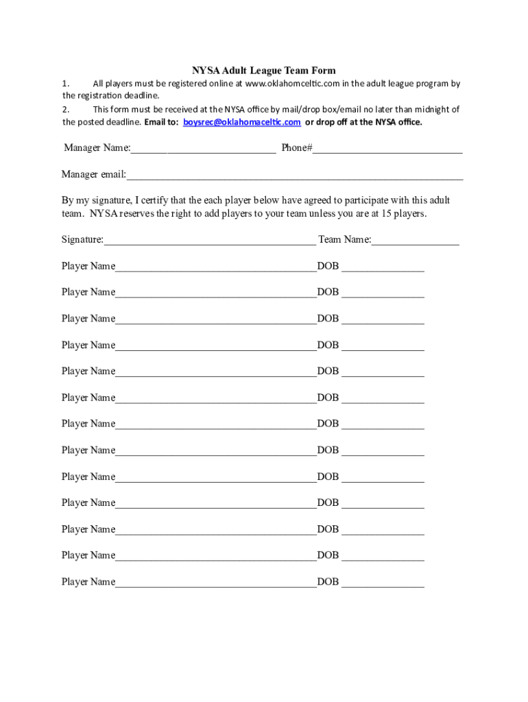 NASA Adult League Team Form 1. All players must be registered online at www.oklahomceltic.com in the adult league program by the registration deadline. 2. This form must be received at the NASA office