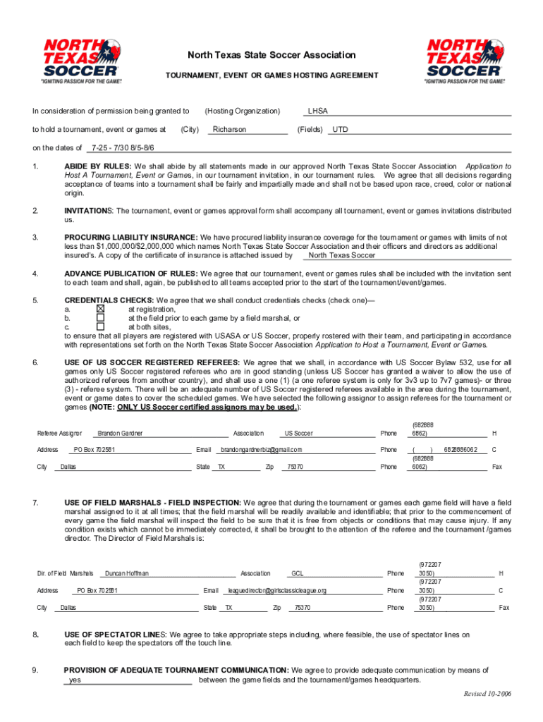 North Texas State Soccer Association TOURNAMENT, EVENT OR GAMES HOSTING AGREEMENT In consideration of permission being granted to hold a tournament, event or games at on the dates of(Hosting Organization)(City)RicharsonLHSA