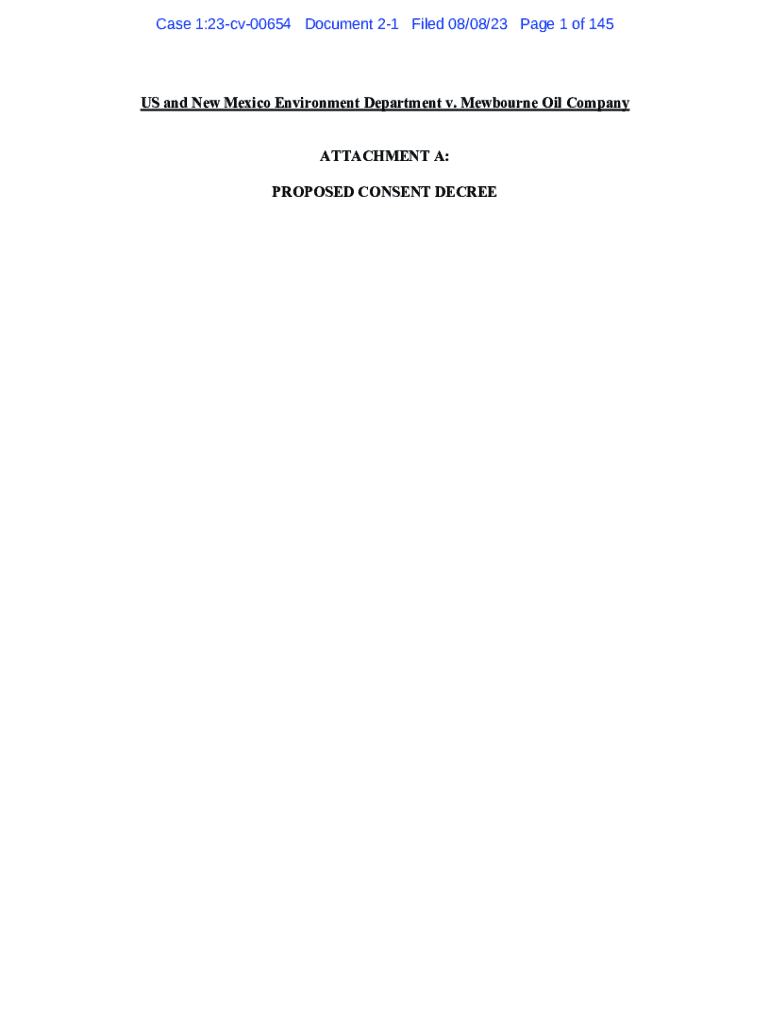 Case 1:23cv00654 Document 21 Filed 08/08/23-Page 1 of 145US and New Mexico Environment Department v. Melbourne Oil Company ATTACHMENT A: PROPOSED CONSENT DECREE Case 1:23cv00654 Document 21 Filed