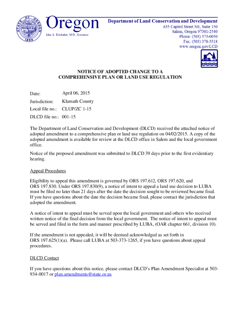 NOTICE OF ADOPTED CHANGE TO A COMPREHENSIVE PLAN OR LAND USE REGULATION Date:April 06, 2015Jurisdiction:Namath CountyLocal file no.:CLUB/ZC 115DLCD file no.: 00115 The Department of Land Conservation