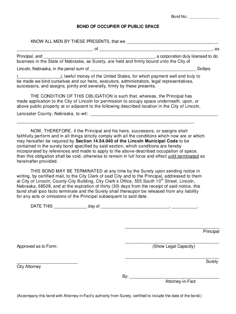 Bond No.: ___BOND OF OCCUPIER OF PUBLIC SPACEKNOW ALL MEN BY THESE PRESENTS, that we ___ ___, of ___, as Principal, and ___, a corporation duly licensed to do business in the State of Nebraska, as