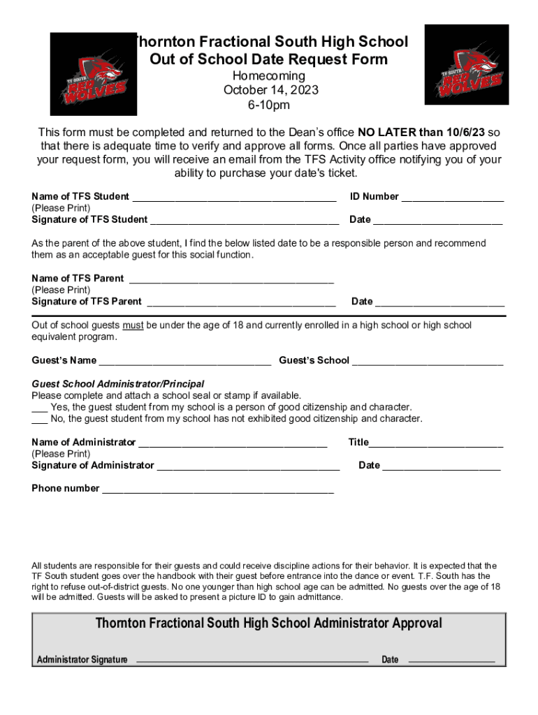 Thornton Fractional South High School Out of School Date Request Form Homecoming October 14, 2023 610pm This form must be completed and returned to the Deans' office NO LATER than 10/6/23 so that