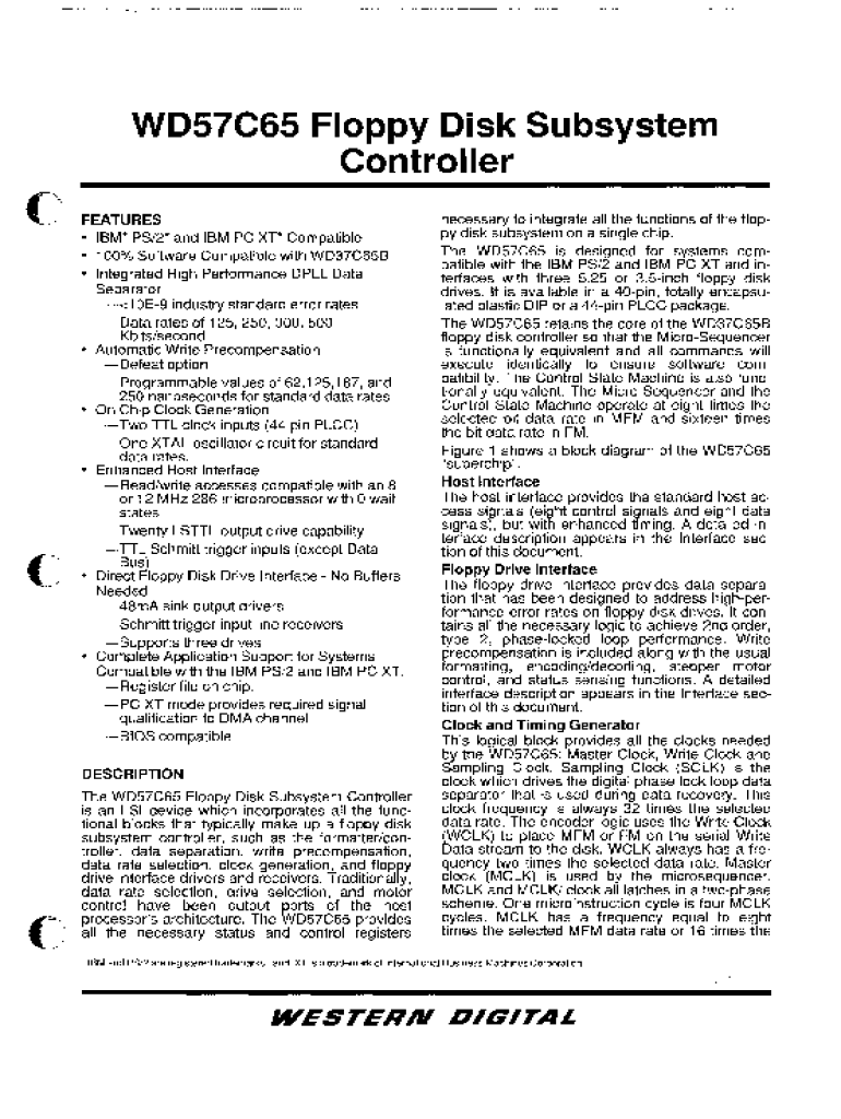 WD57C65 Floppy Disk Subsystem Controller FEATURES IBM* PS/2* and IBM PC AT* Compatible 100% Software Compatible with WD37C65B Integrated High Performance DOLL Data Separator 1 OE9 industry standard