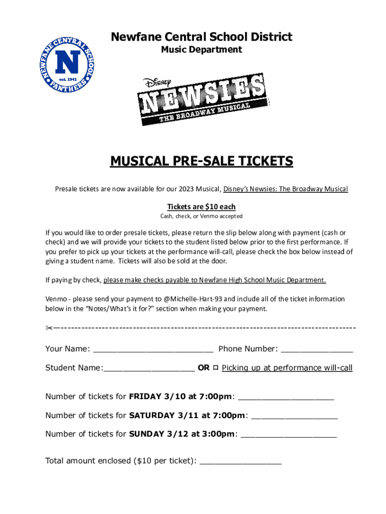Newman Central School District Music DepartmentMUSICAL PRESALE TICKETS are now available for our 2023 Musical, Disney's Newsies: The Broadway MusicalTickets are $10 each Cash, check, or Venmo accepted
